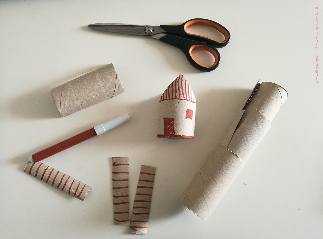 Dal’ultimo rotolo ricaviamo tre strisce di cartoncino per fare le scalette (oppure puoi disegnarle direttamente sul tronco)