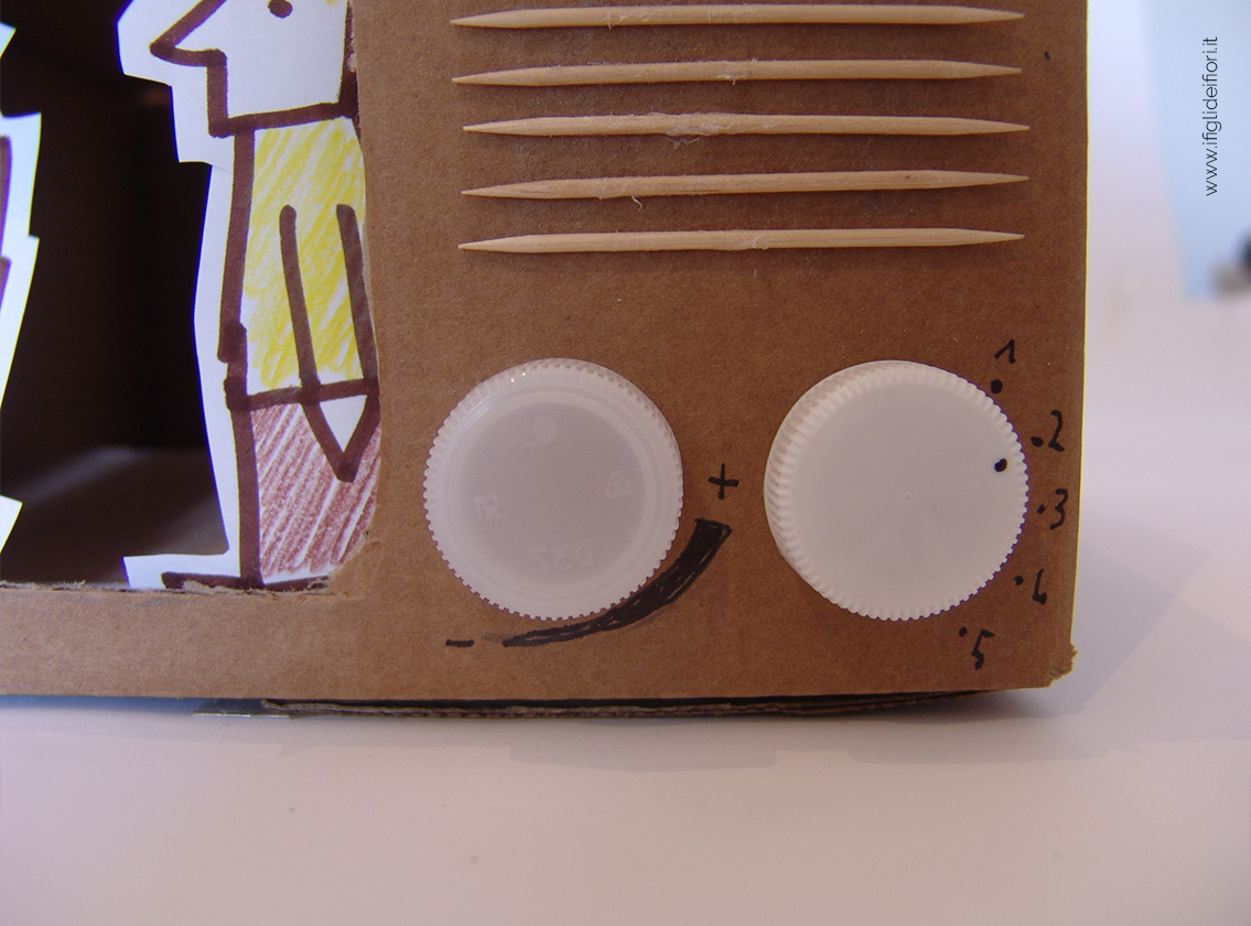 Cosa serve: scatola di cartone, cutter, tappi di plastica, pennarello, colla, forbici