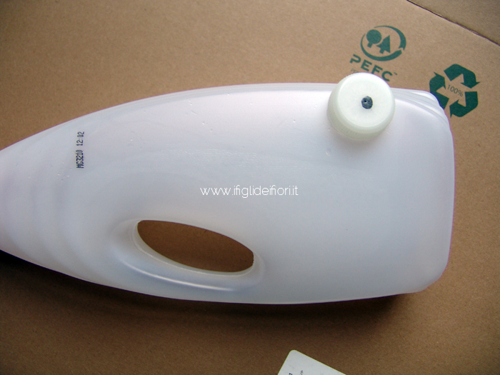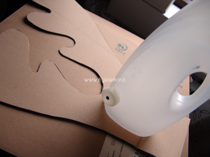Un flacone di detersivo vuoto, cartone, forbici, colla.
