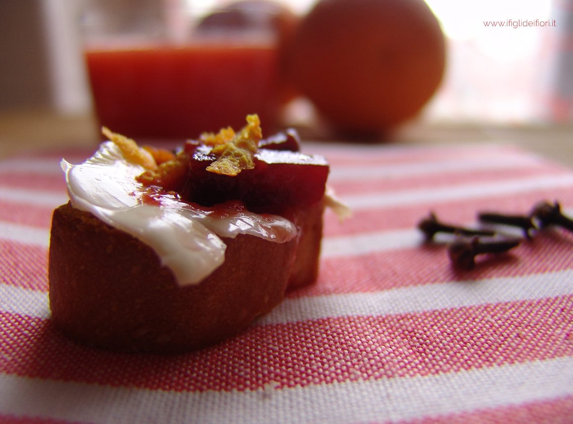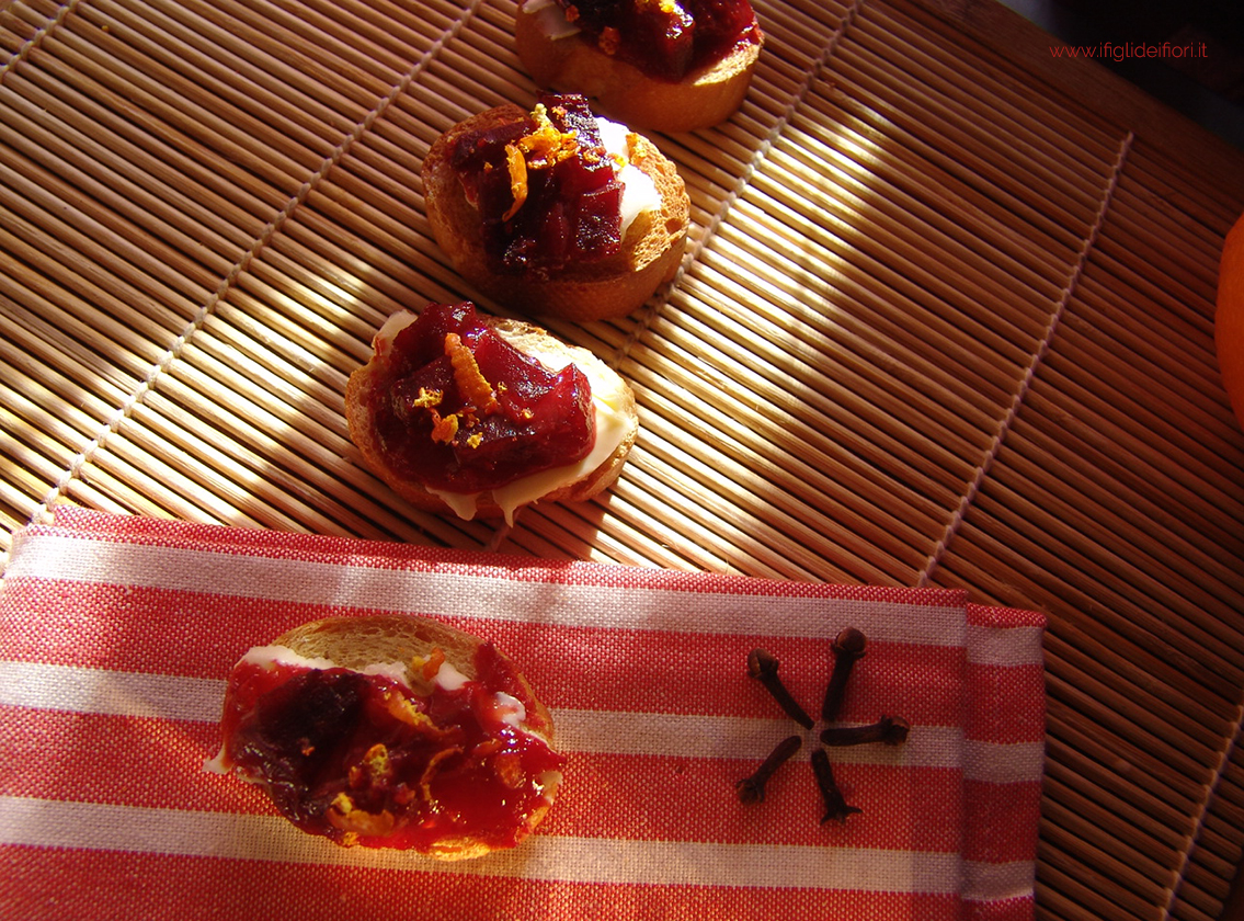 Imburra i crostini e cospargili con la marmellata di barbietole e zesta d’arancia grattugiata.